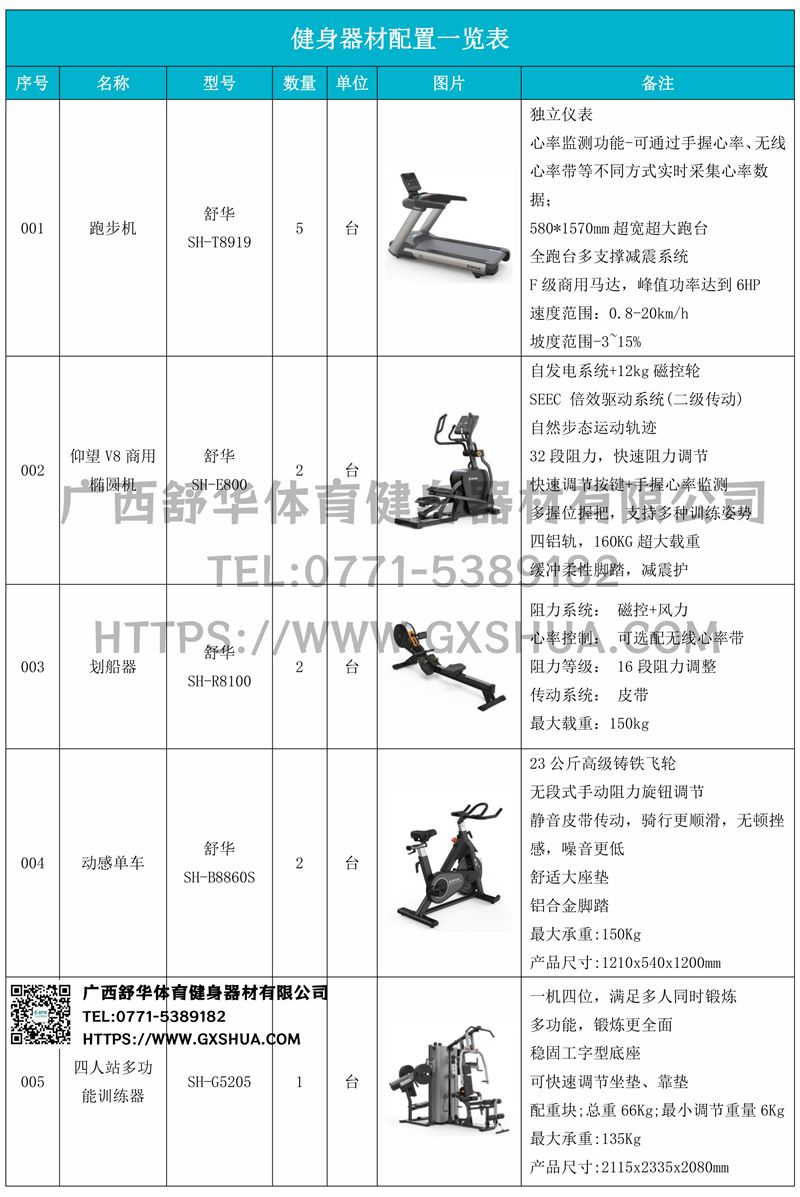 1.银河GalaxyV9跑步机SH-T8919*5台-580*1570mm超宽超大跑台-跑感舒适,跑台整体安全稳定;全跑台多支撑减震平台,保证跑台超强支撑力,达到180kg支撑,满足专业健身房需求。F级商用马达-超强马达,AC 3.0HP 交流,峰值功率达到6HP,F级商用品质。速度范围达到0.8-20km/h;V9跑步机可实现跑台扬升功能,坡度范围-3~15%,满足客户不同的锻炼需求。