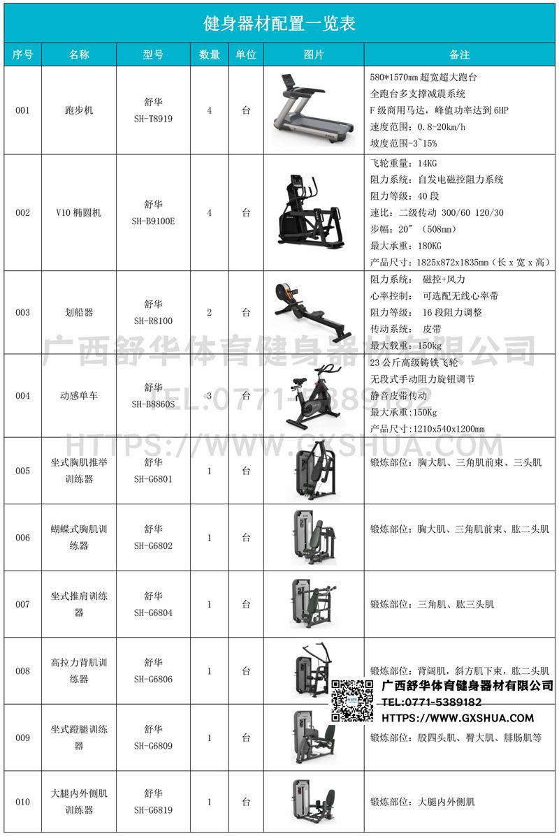 1.银河GalaxyV9跑步机SH-T8919*4台-580*1570mm超宽超大跑台-跑感舒适,跑台整体安全稳定;全跑台多支撑减震平台,保证跑台超强支撑力,达到180kg支撑,满足专业健身房需求。F级商用马达-超强马达,AC 3.0HP 交流,峰值功率达到6HP,F级商用品质。速度范围达到0.8-20km/h;V9跑步机可实现跑台扬升功能,坡度范围-3~15%,满足客户不同的锻炼需求。