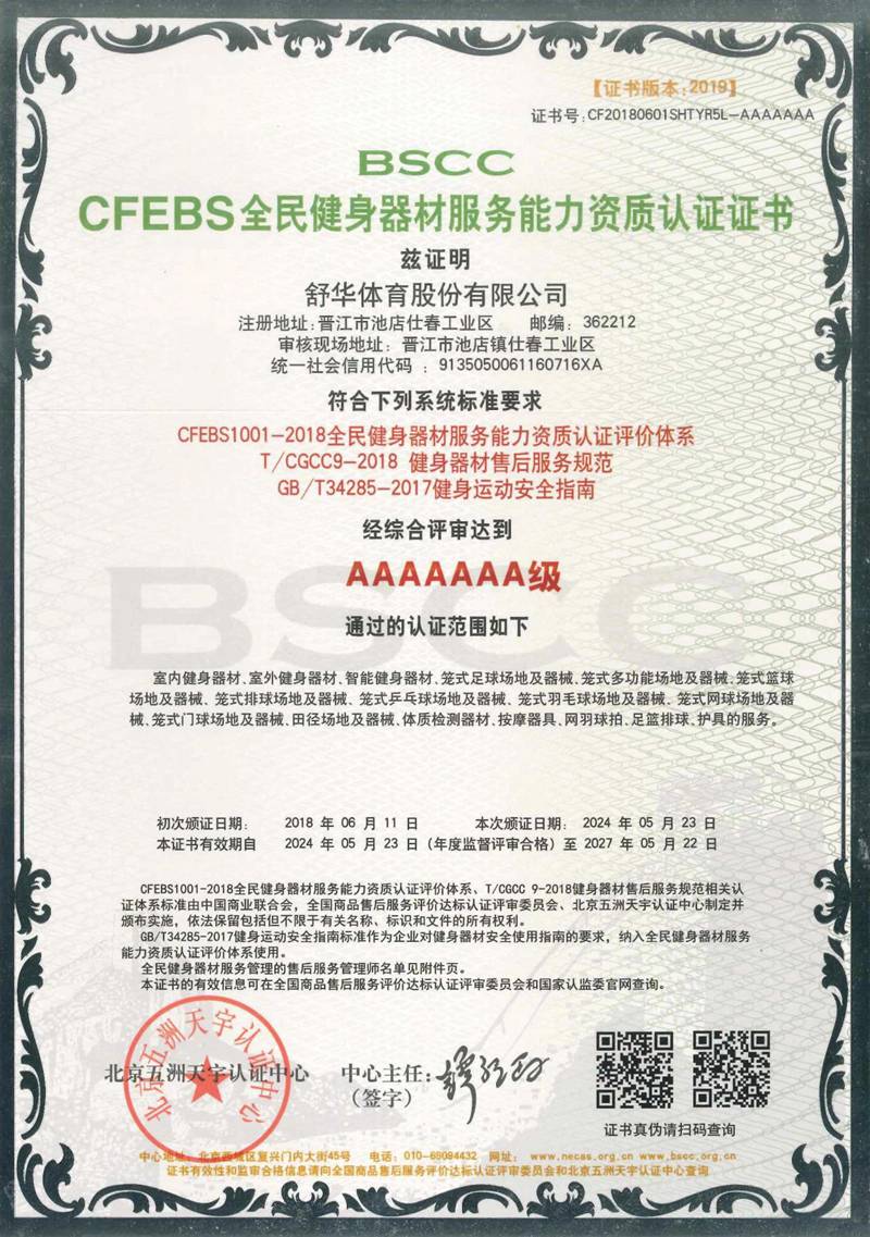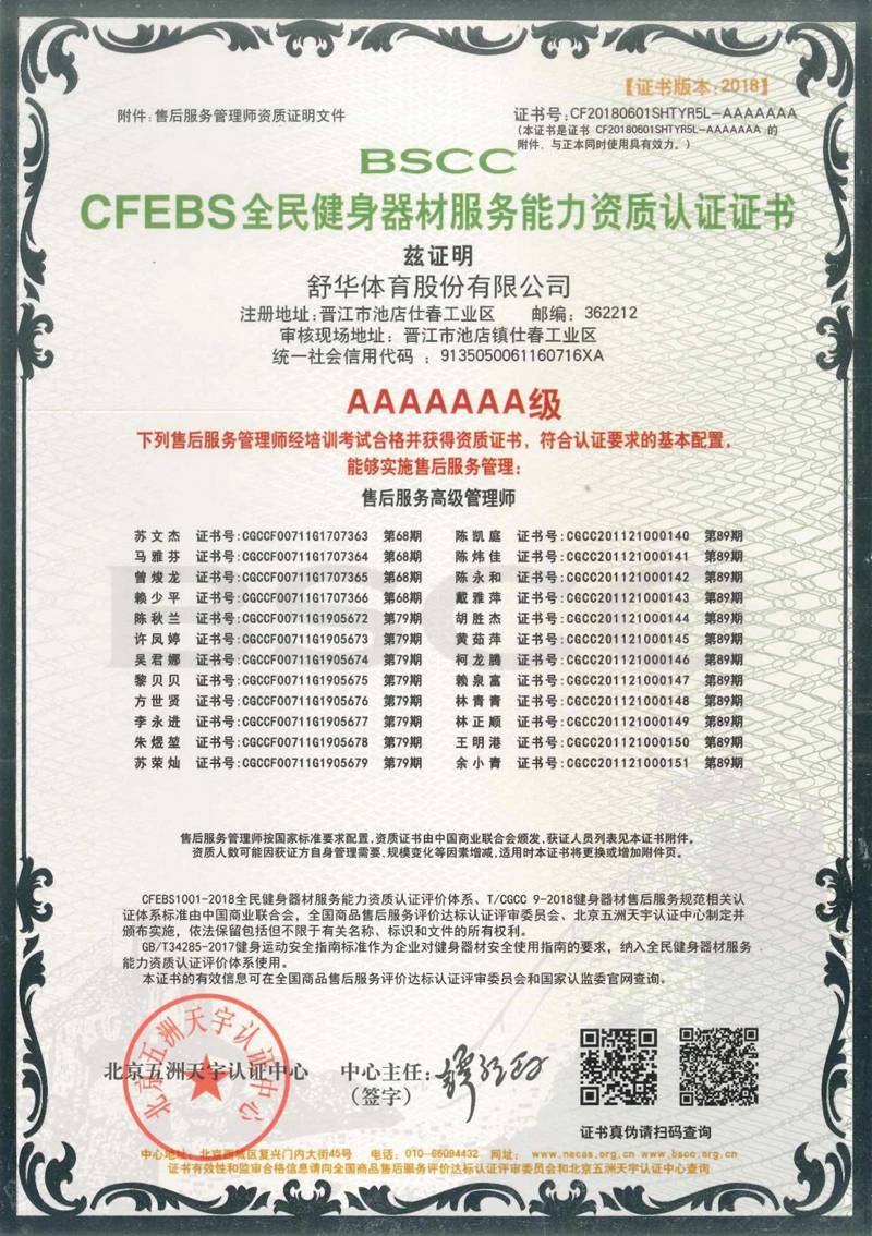 银河Galaxy以用户满意作为服务追求,凭借专业的技术能力及服务保障能力、有效的售后服务体系,获得“BSCC-CFEBS 全民健身器材服务能力资质认证证书 AAAAAAA 级”,部分员工经培训考试合格并获得“BSCC-CFEBS 全民健身器材服务能力资质认证证书-售后服务高级管理师(AAAAAA 级)。